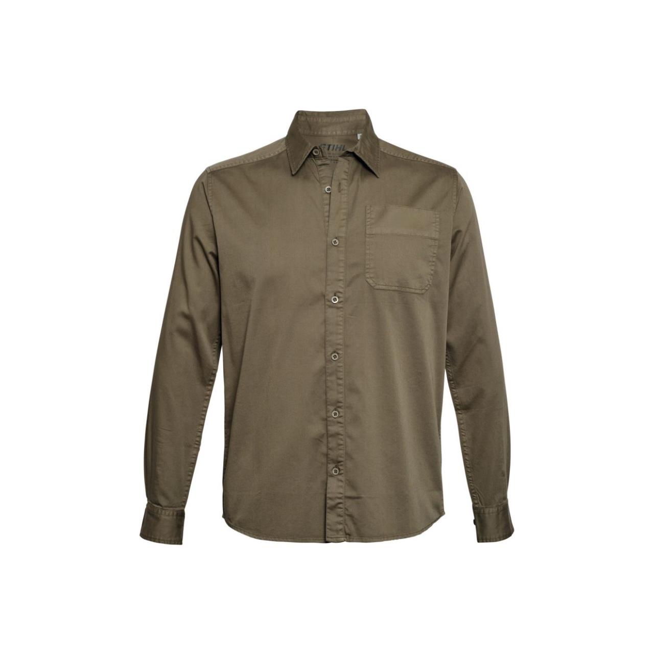 Hemd in gewaschener Optik. Lyocell ist ein industriell gefertigtes, nachhaltiges Material aus Holzfaser. Das Hemd verfügt über die üblichen Features wie Knopfleiste, Hemdkragen und aufgenähte Brusttaschen. Ein STIHL Label ziert die Seitennaht.